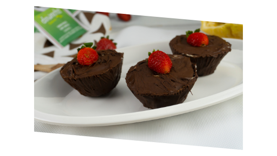 - Adicione a mistura e os morangos dentro dos copinhos de chocolate.