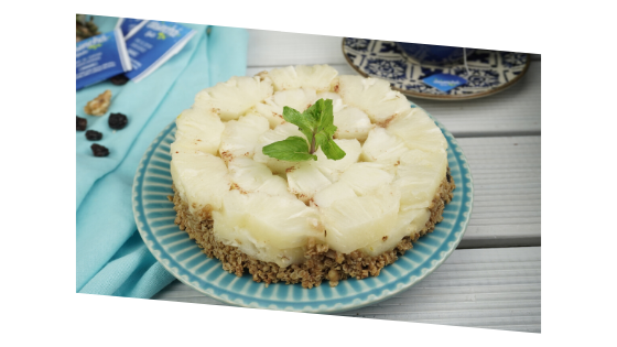 Unte uma forma com fundo removível e vá adicionando duas camadas de abacaxi, adicione a canela, a mistura, cubra com papel alumínio e leve ao forno por 10 min.